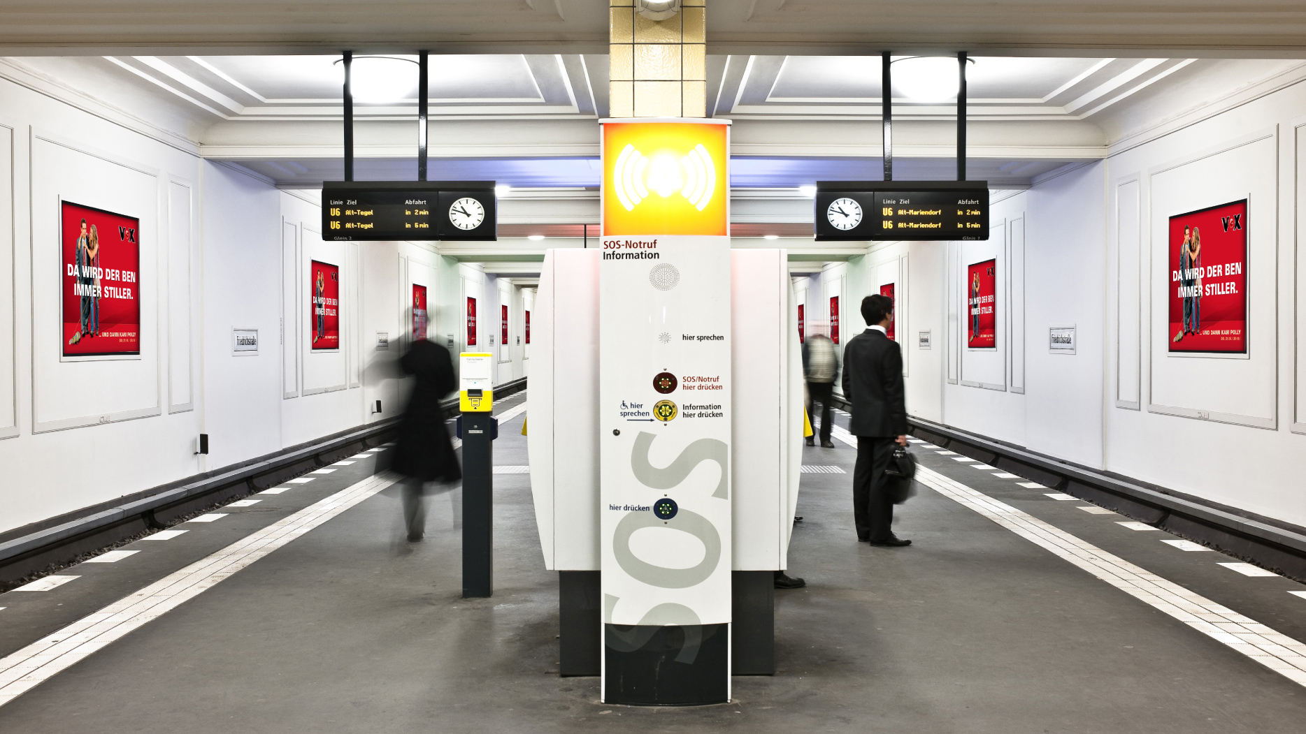 Wahlpflichtfach / PraxisseminarFür die 12 großformatigen Projektionsflächen entlang des Bahnsteigs des stark frequentierten U-Bahnhofs Friedrichstraße in Berlin Mitte wurden kurze Videoarbeiten entwickelt und realisiert. Es handelte sich dabei um mehrkanalige Arbeiten, die parallel oder zeitversetzt abgespielt wurden. Da die Video-Files einzeln angesteuert und programmiert werden konnten, waren ganz unterschiedliche und hochkomplexe Präsentationsformen möglich.